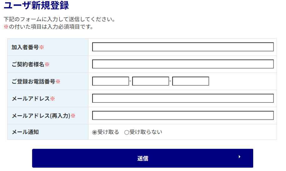 初めてマイページをご利用される方は新規登録手続きを行って頂く必要がございます。新規登録時にはご契約者様のご登録情報及び、「加入者番号」が必要です。詳しくは下記、新規ご利用までの流れをご確認ください。
